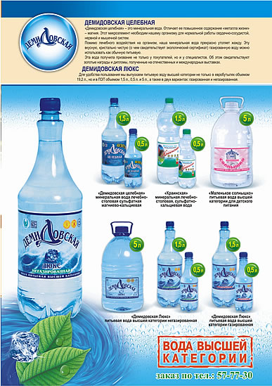 Наши клиенты утверждают, что вода «Демидовская Люкс» самая вкусная. Приготовленные на ее основе напитки, супы, детское питание и многие другие продукты не идут в сравнение ни с какими другими. Попробуйте и убедитесь сами!
